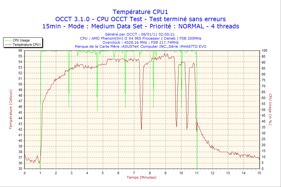 Voilà c'est fait, j'ai overclocker mon processeur AMD Phenom II X4 965 à 4.0 Ghz (4.027 exactement), tout est stable et les températures avec un ventirad Noctua et un ventilateur nzxt à l'arriere(le second ne ventile que le disque dur a cause des câblages et les deux autres sont désactiver car trop brouillant) sont relativement bonne 55° à 100%, niveau sonore rien a signaler je ne vois pas la différence.