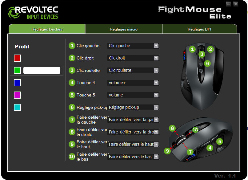Elle est réglable de 90dpi @ 5000, 4 profils DPI, 5 modes macro (différentiés grâce aux couleurs)