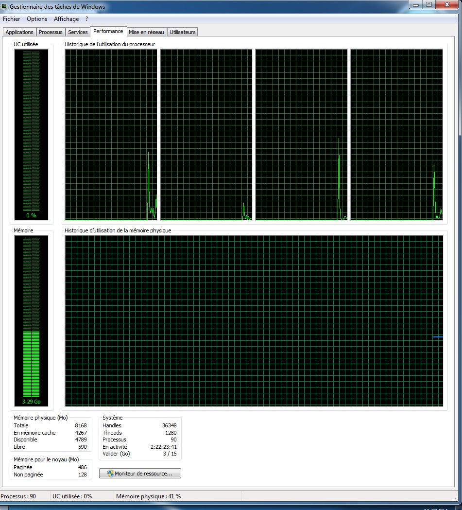 Screen pris à l'instant...avec une utilisation plus que typique sur mon PC (j'ai 4 fenêtres chrome ouvertes pour 6 onglets au tout, skype, media player, Kaspersky, AI tools, et excel (petit fichier) lancés).