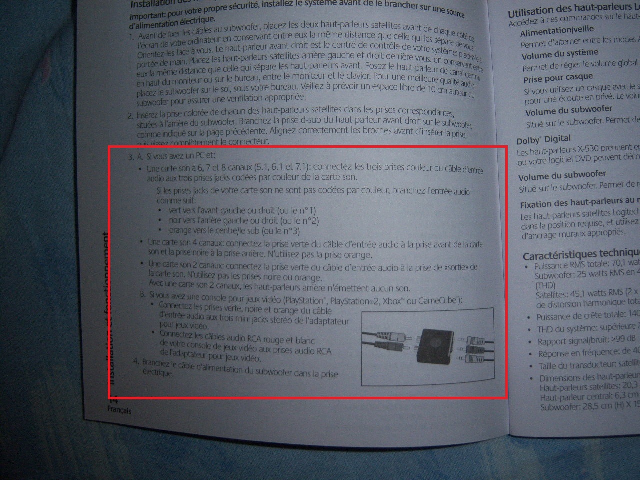 EN gros les fiches du kit, t'as une noire pour les basses, une verte pour les deux front + le casque qui s'adapte sur la droite front, et l'orange les deux arrières.