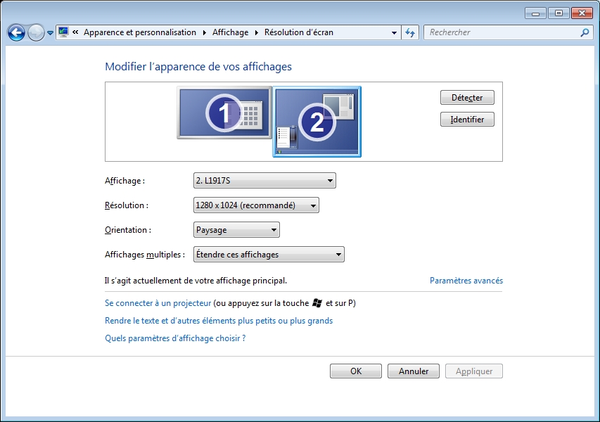 il faut que dans les paramettre windows tu configures: "étendre les affichages", ensuite, regarde bien si les résolution des deux ecran sont correct.