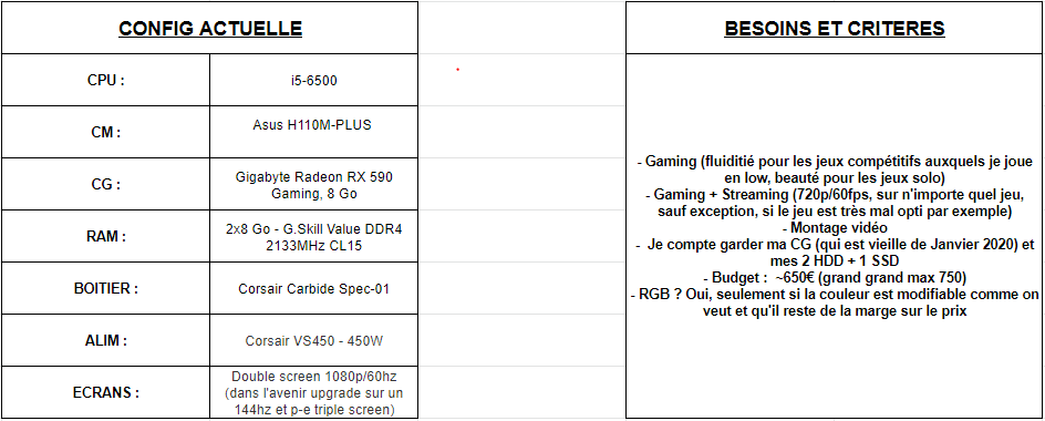 L'idée c'est que je reparte sur de bonnes bases et que je sois tranquille pendant au moins deux ans quoi. Et pour le coup avec ce que j'ai là j'ai l'impression d'être en retard au niveau des composants. Je suis quelqu'un qui prend vraiment soin de son matériel (que ce soit physique et logiciel), et pourtant sur certains jeux j'ai vraiment l'impression que le PC a du mal. Sur CoD: Modern Warfare mon CPU est à 100% tout le temps. In-game ça marche très bien, mais par exemple sur Discord ben impossible d'y aller. Ou alors par exemple sur CS:GO, qui normalement ne demande pas un gros PC, ben des fois je me retrouve à 50 fps en full low quoi.