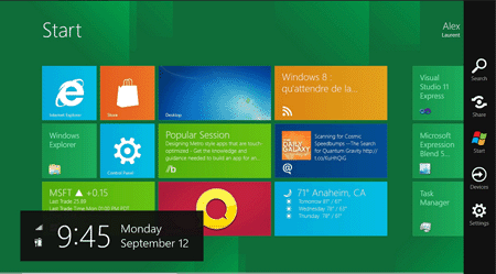Comme vous pouvez le voir sur l’image ci-dessus, le bureau classique avec ses icones et le menu Démarrer laisse place à une nouvelle interface épurée utilisant des rectangles (tuiles) nommée « Metro » reprise de Windows Phone et très adaptée au tactile. Il est toutefois possible de revenir à une interface classique de bureau avec des icônes et l’Explorateur (avec l’ajout du Ruban façon Office). Il est même possible d’utiliser les deux interfaces simultanément sur un ou deux écrans.