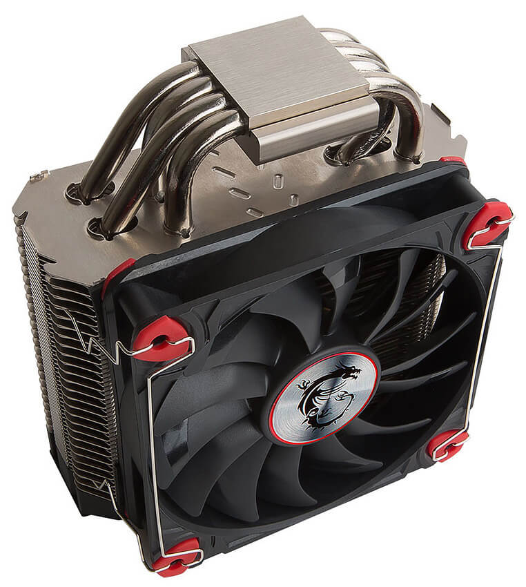 La base du ventirad est en cuivre (argenté) et les ailettes sont en aluminium. MSI a également ajouté un cache en plastique noir sur le dessus.